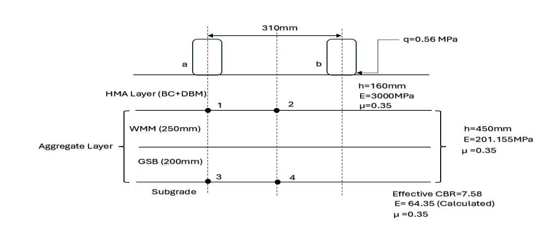 ThepavementisexaminedusingtheIITPAVEprogramonceithasbeendesignedinaccordancewithIRCguidelinestoseeifthe thicknessofeachlayerhasbeenchosentoadequatelysupporttheloadandstrainsthatthepavementhasdeveloped.Table6 showstheparametersrequiredforthedesignofflexiblepavementwithitsstress-strainanalysisinFigure3.