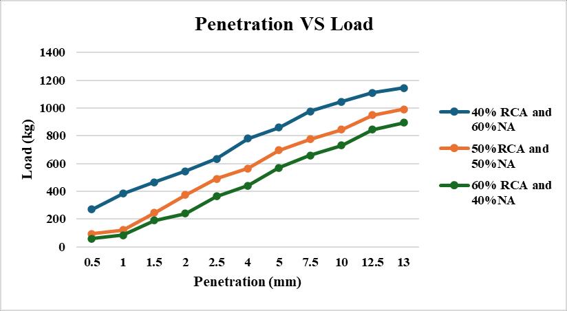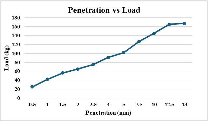 AccordancewithASTMD-1883,theCBRofthematerialsat56blowspercompactionlayer(fivelayers)wasusedtoassesstheir resistance.Theidealmoisturecontentdiscoveredintheappropriatestandardproctorcompactiontestwasusedtopreparethe samples.Theoutcomeswerecontrastedwiththestandard'sminimalrequirementsforGSB.Thepenetrationvs.loadcharts wereusedtocalculatetheCBRofthethreepartiallyreplacedGSBsamples.Thesamplecontaining60%Recycledconcrete aggregate(RCA)and40%naturalaggregate(NA)showedaCBRvalueof35.60%,followingthesamplescontaining50%RCA and50%NAand40%RCAand60%NAshowingaCBRvalueof45.90and59.49%,respectively.Chart8showsthecomparison betweenpenetrationvsloadforvarioussamples.