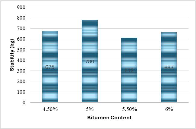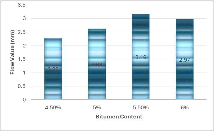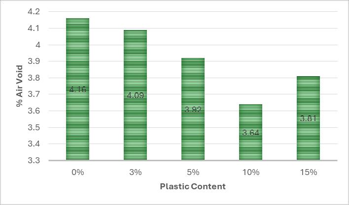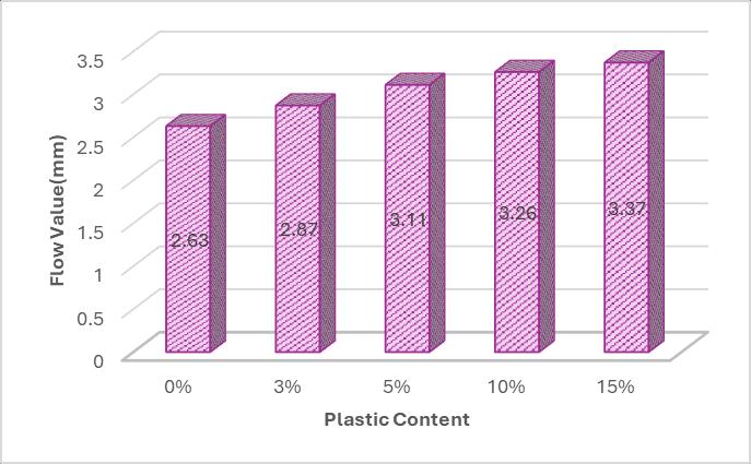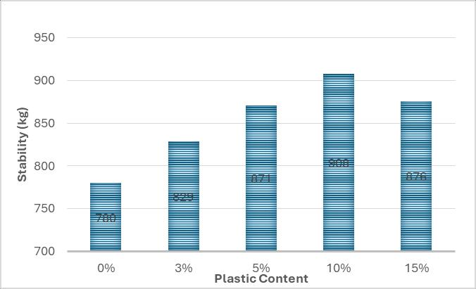 TheMarshallStabilityofaspecimenduringtestingisthehighestloadthatcausesfailureinthespecimen.Heatedtoaspecific temperaturebeforebeingpositionedinauniquetestingfixture,theloadsteadilyincreasedataconstantrateof5cmper minute.Duringthestabilitytest,adialgaugeisutilizedtomeasuretheverticaldeformationofthespecimen.TheMarshallFlow valueofthespecimenisthedeformationatthefailurepointmeasuredinincrementsof0.25mm. Initially,variousspecimens arepreparedwithvaryingbitumencontent.ThespecimenshowingthelargestMarshallstabilityisconsideredforfurtherstudy withitsgraph between bitumenand stabilityvalue (Chart1)and flow value(Chart 2),whichare depicted below.Plastic percentagesof3,5,10,and15%areincludedtoexaminehowreplacingplasticimpactstheMarshallcharacteristicsofthe bitumenmixture.Therelationshipbetweenplasticpercentageandstability(Chart3),flowvalue(Chart4),airvoid(Chart5), andbulkdensity(Chart6)indicateshowtheplasticpercentageinbitumenaffectsitsproperties.Theevaluationindicatesthat theMarshallStabilitytestdemonstratesadecreasewhentheplasticpercentageincreasesto15%inplasticreplacement.The graphillustratesthevariationinwasteplasticpercentageusedasareplacementforbitumeninbitumenconcretemixesandits correspondingeffects.Theresultsforplasticsubstitutionaredepictedinthesegraphs