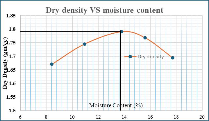 Thecompactionpropertieswereassessedusingthestandardproctortestandthreetestswereconductedonsampleswith varyingmoisturelevels,andtheoutcomesfortheassessedmaterialsaredisplayedinthefigure.ThebelowTable3showsa detaileddrydensityandoptimummoisturecontentvaluesatvariouspartiallyreplacedsamplesforGSB.