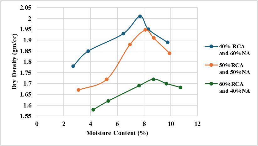 RCAhashigherwaterabsorptionascomparedtonaturalaggregate. Thedataclearlyshowsthispatternwiththeoptimal moisturecontentincreasingwithincreasingRCAcontentwhichcanbeeasilydemonstratedusingchart7 Ontheotherhand,it was anticipated that the dry density of samples decreases as the content of RCA increases in comparison to natural GSB becauseRCAhasalowerdensitythanthenaturalaggregate.