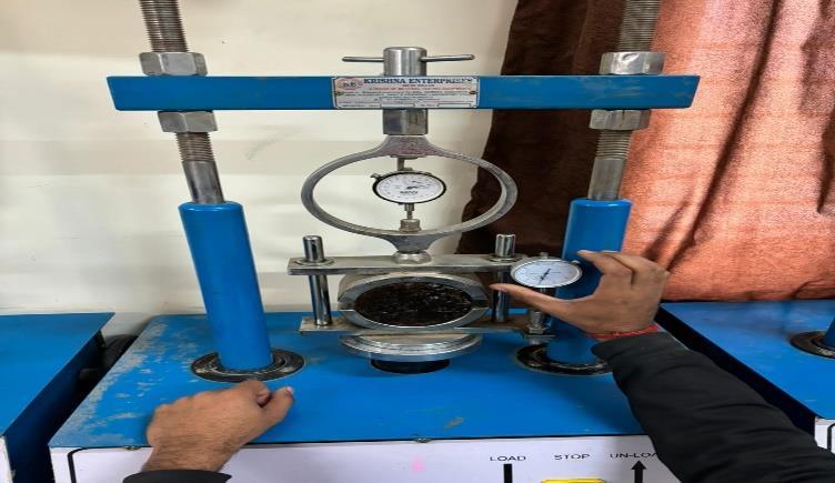 In the dry mix method, plastic is melted and combined with bitumen at a highly controlled temperature. This mixture is combinedwiththeaggregatestopreparebitumenconcrete.Thismethodismorecost-effectivesinceituseslessaggregatein themix.Toensureuniformityandconsistency,thedrymixpreparationiscarriedoutundercarefullymonitoredcircumstances, whichmayincludetemperaturesandmixingtimes.ThepreparedspecimensareloadedintheMarshalltestsetupasshownin belowFigure1.