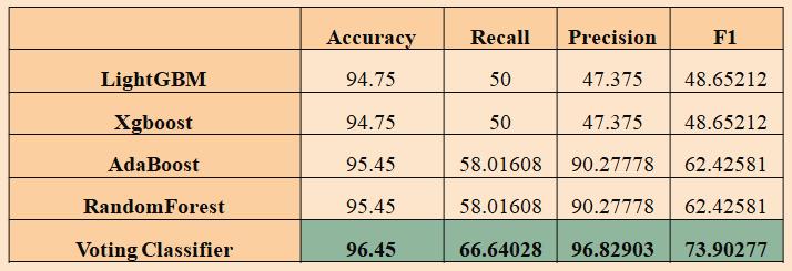 This is subsequently the presentation estimates table. Furthermore, here we can track down the names of the calculationsalongwiththeiraccuracy,precision,recall,f1score, and particularity values got by them. In all the presentation measures, the augmentation voting classifier hassosurpassedanyremainingmodels.