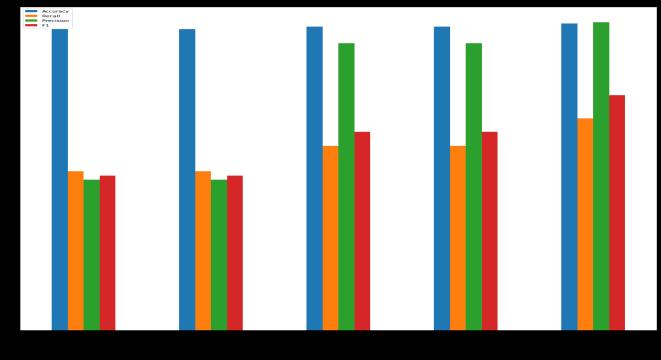 Blue color bar here shows accuracy; orange marks recall; greenmarksprecision;redisforf1score.