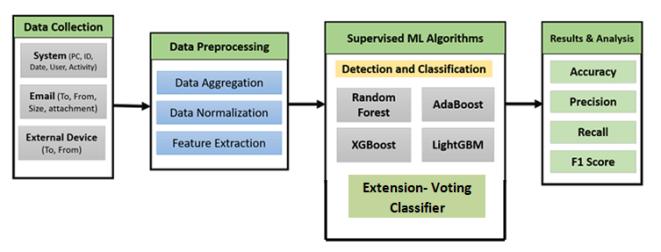 ML calculations, and results investigation. Tweaked dataset made from numerous CERT dataset documents is utilized in the information gathering stage. The accumulated information then, at that point, goes through preprocessing utilizing techniques including information collection,normalizing,andhighlightextractiontoworkon its quality and pertinence. Applying ML calculations “Random Forest, AdaBoost, XGBoost, and LightGBM” [31, 32] and a voting classifier as an expansion to the preprocessed information for the detection and classification of privilege escalation attacks characterizes the center of the framework. Finally, the framework completelyanalyzestheresults,surveyingtheexhibitionof each and every procedure and offering comprehension of the overall adequacy of the framework in spotting insider dangers.ThroughMLdrawsnear,thisengineeringensures acalculatedareasofstrengthforandtodealwithprivilege escalationassaults.
