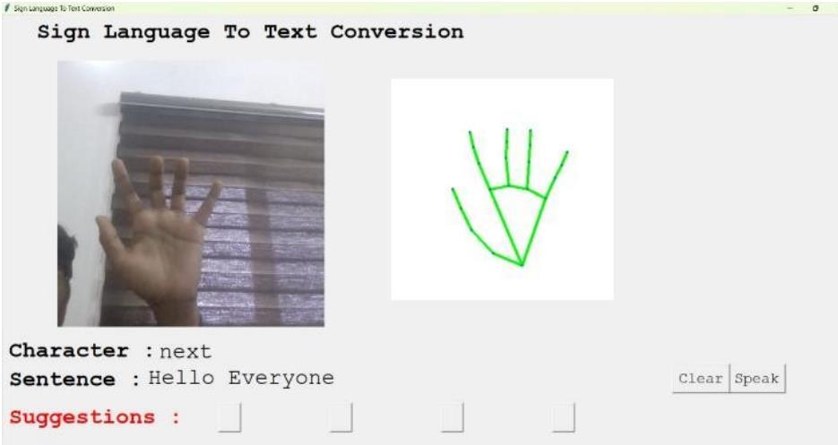 The translation module was tested by converting the recognizedgesturesfirsttotextandthentranslatingthetext intotargetedlanguageusingthetranslatelibrary.