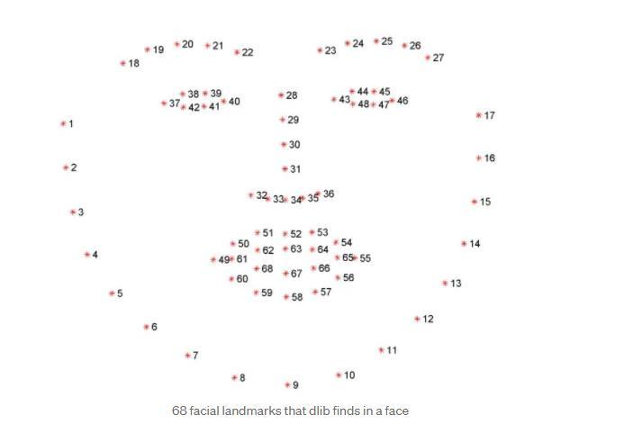 Following face detection, the algorithm marks important facial features using facial landmarking. The dlib library, whichusestheiBUG300-Wdataset adatasetintendedto identify68differentfaciallandmarks isusedtoaccomplish this. Important regions surrounding the mouth, nose, jawline,andeyesareincludedintheselandmarks.Theareas surroundingthemouthand eyesare especiallycrucial for detecting drowsiness because they aid in tracking certain signsofexhaustion,likeyawnsandeyeblinks.Calculating certainmetricsliketheEyeAspectRatio(EAR)andMouth AspectRatio(MAR)requiresaccuratecoordinates,whichare providedbythe68-pointfaciallandmarkmodelindlib.