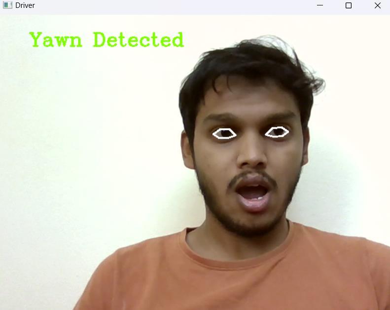 Figure5.2illustrateshowthesystemindicatesayawnand recommends motels in the area for the driver to stay at when their MAR surpasses the predetermined level. By addressing early indicators of fatigue, this alert seeks to persuadethedrivertotakearest.Thedetectionguarantees promptactiontopromotesafedriving.