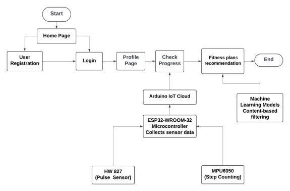 IoT sensors to continuously monitor various health metrics,suchasheartrate,stepcount,andactivitylevels. The data collected is processed through machine learning algorithms that analyze user patterns and generate tailored fitness advice to enhance user engagement and outcomes [3]. These devices utilize varioussensorstotrackmetricssuchasheartrate,steps, sleep patterns, and calories burned, offering a comprehensiveviewofauser’sfitnessjourney.