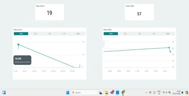 The fitness tracker continuously collects data from the MPU6050 & HW827 sensors, capturing step counts through motion analysis and heart rate by monitoring pulse signals. This data, displayed as daily step counts, average and peak heart rates during activity, reveals trends like increased heart rate during exercise or reduced steps on sedentary latency, and power management, also promote days, visualized in the ArduinoIoTClouddashboards.