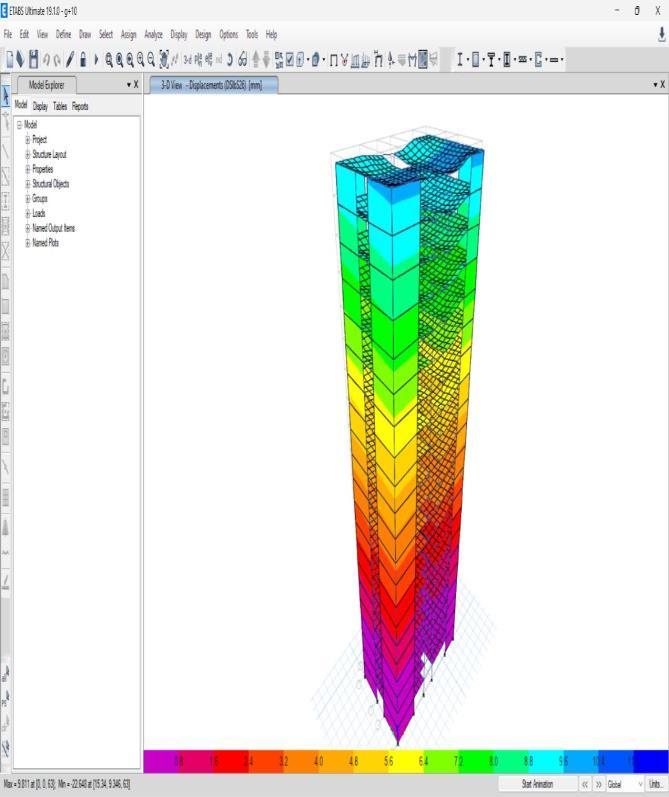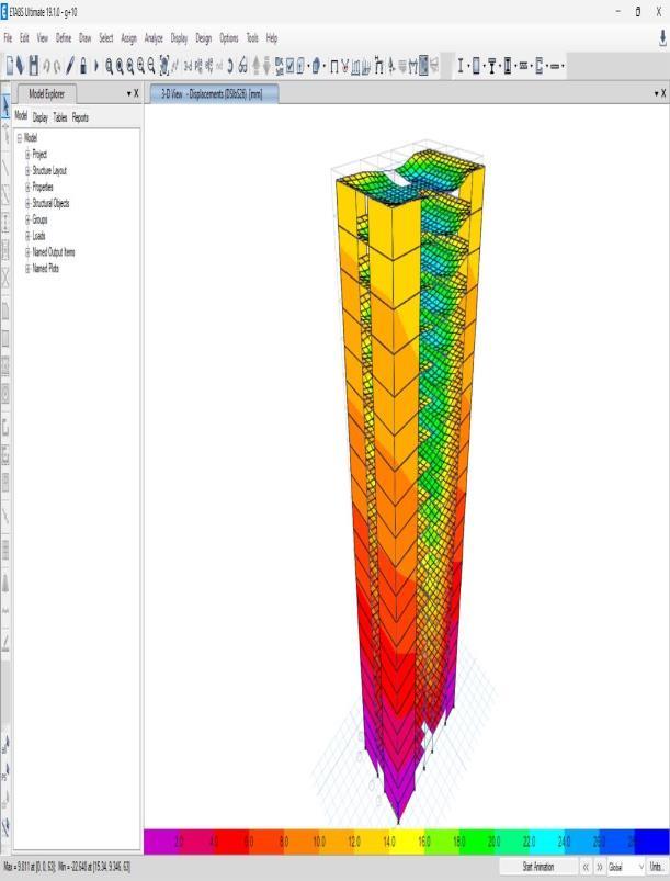 ThisETABSanalysisdemonstratesstructuraldesignundervariousloadcases,showingdeformationthroughacolor-coded gradient. Engineers evaluate minimum and maximum displacements to ensure safety and compliance. By analyzing load combinations, performing detailed calculations, and verifying structural checks, they optimize the building’s stability, strength,andresilienceunderreal-worldconditions.
