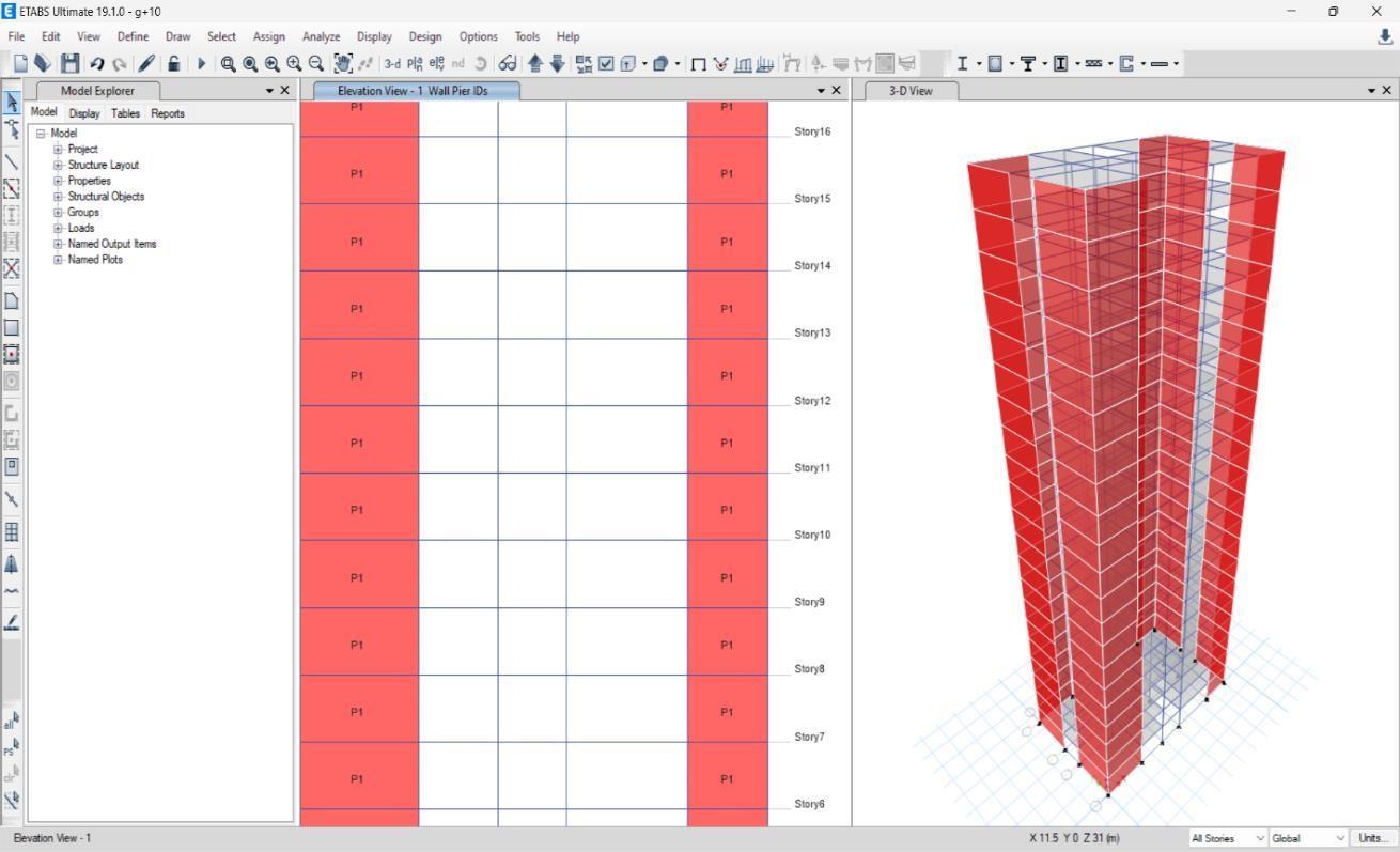 The image showcases ETABS software analyzing a high-rise structure. Red-highlighted wall piers ("P1") are displayed in the elevation and 3D views, spanning multiple stories. These structural elements are critical for lateral load resistance, suchasseismicorwindforces.ETABSprovidesefficientvisualizationandprecisedesignoptimizationforbuildingstability