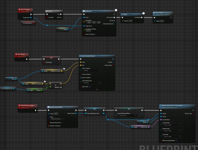To detect the player, the AI Perception System is used, whichcanincludesenseslikevisionandhearing.TheSight sense detects the player within a certain range and line of sight, while the Hearing sense can react to noise, such as footstepsorgunfire.Thesesensoryinputstrigger behavior transitions and actions in the AI. Once the AI can perceive theplayer,itusesBlackboardstostorevariablessuchasthe player’s position or the last known location, which are criticalfordecision-making.