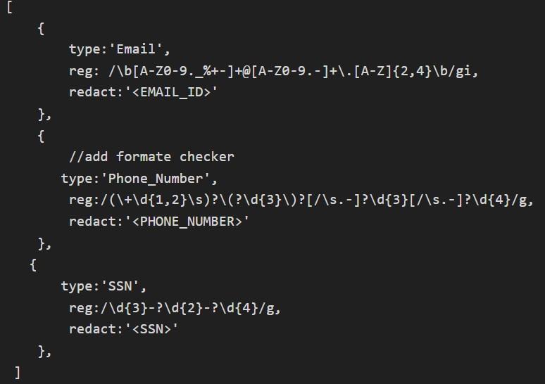 ● Redaction: Replaces sensitive data with asterisks (e.g.,john.doe@example.com → ********).