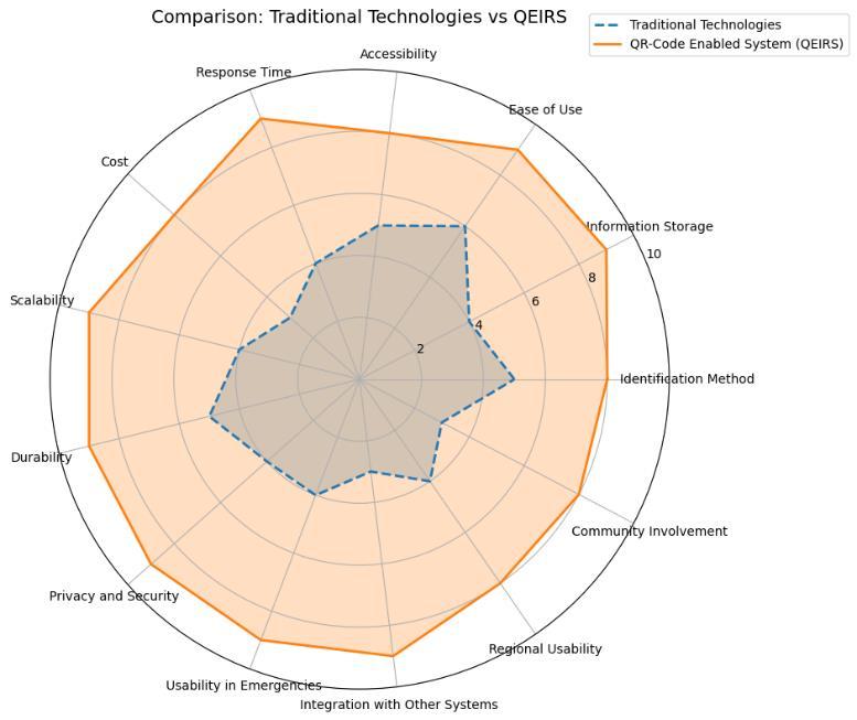 The graph compares traditional methods of locating missingindividualswiththeQR-CodeEnabledIdentification andRecoverySystem(QEIRS)intermsofkeyattributes.