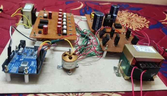 ThehardwarecircuitofPV basedLuoconverterfedBLDC motorisshowninfigure10.230VoltssinglephaseACsupply isprovidedasinputtostep-downtransformerof230/12V, 3A, is then fed to the Positive Output Super-Lift Luo Convertervia rectifier.TheLuoConvertergivesanoutput voltageof36voltsthatisfurtherconnectedtothreephase inverter.Theoutputofthreephaseinverterisconnectedtoa 1000KVBLDCmotor.
