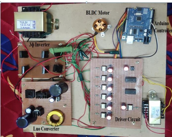 Fromthesimulationresults,itwasobservedthattheoutput poweroftheLuoconverteris2000Wandhighvoltagegain of240Voltsfrom35.5VoltsPVinputsupplywasobtained. TheBLDCmotorrunsatitsratedspeedirrespectiveofthe loadvariation.Thehardwarewasimplementedforsmaller ratingandwasconnectedtoaBLDCmotorof1000KV.
