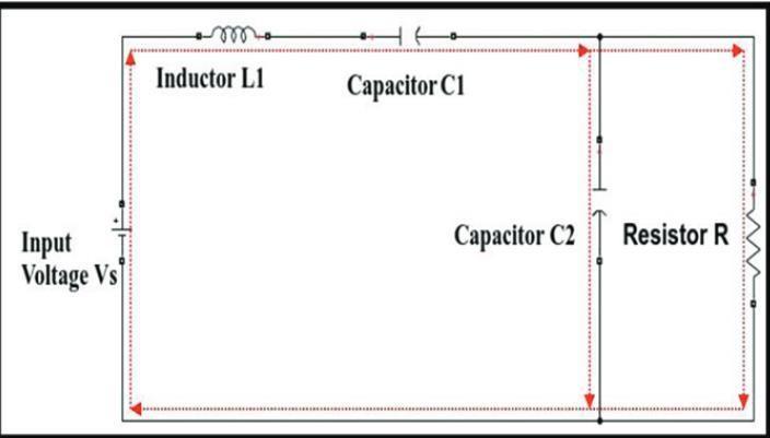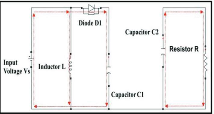 Mode 1: Duringmode1operation,theswitchSisconsidered tobeinONstatethereby,capacitorC1getschargedtoVs The currentiL1flowingthroughinductorincreaseswithvoltage Vs.TheinputcurrentiswillbeequaltoiL1+ic1.Themode1 operation is depicted clearly through Figure 3. When the switchisclosed,thediodeD1isforwardbiasedanddiodeD2 isintheOFFstate.