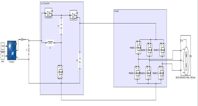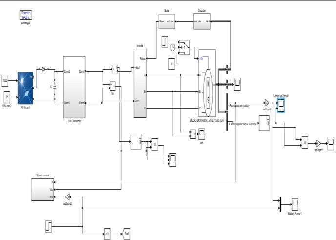speed controller consists of two loops, speed control loop senses the reference speed and measured speed and the error is provided for PI controller generates voltage reference isprovidedtovoltagecontrolloop generatesduty ratiobasedontheerrorinvoltageofreferenceandconverter outputvoltage.ThegenerateddutyratioisprovidedforPWM pulsegenerationfortheluoconverter.Theoutputoftheluo converterisprovidedtotheinverteroperatesbasedonthe pulses generated using hall signals. The inverter output is providedtotheBLDCmotorof400V,50Hz,2KVA,1500rpm. Figure 5, shows the simulation circuit of the proposed system.