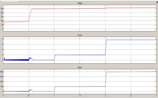 Figure6,showsLuoconverteroutputvoltage,currentand powerwaveform.Thevoltageisaround80Vfromt=0to0.5s (500rpm)andincreasedto250Vfromt=0.5s(1500rpm).The currentisnearlyzerofromt=0to1s(Noload)andincreased to3Afromt=1sto2s(25%load)andagainincreasedto12A att=2s(Fullload)