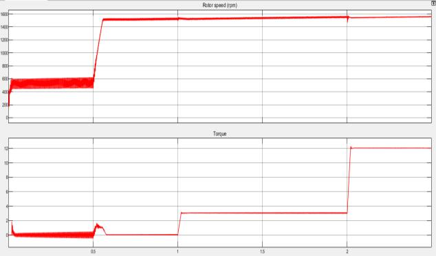 Figure 7, shows the speed torque waveforms of the BLDC motor.Initiallythespeedreferenceis500rpmandchanged to1500rpmatt=0.5s.Alsothemotoroperatesundernoload conditionfrom t=0to 1sandthetorque increasesto3Nm (25%load)att=1sandagainincreasedto12Nm(Fullload)at t=2s.