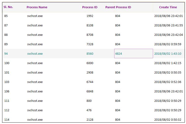 The provided Figure 5 depicts a list of svchost.exe processes running on a Windows system. As mentioned, svchost.exeisacommonsystemprocessthatcanbeusedby malwaretoevadedetection.Analyzingtheimage,weseethat mostsvchost.exeprocesseshaveaParentProcessID(PPID) of804,whichcorrespondstotheservices.exeprocess.Thisis expected behavior for legitimate svchost.exe instances. However,thereisoneprocesswithaPPIDof4824,whichis unusual. This discrepancy raises concerns about the legitimacyofthisparticularsvchost.exeprocess.