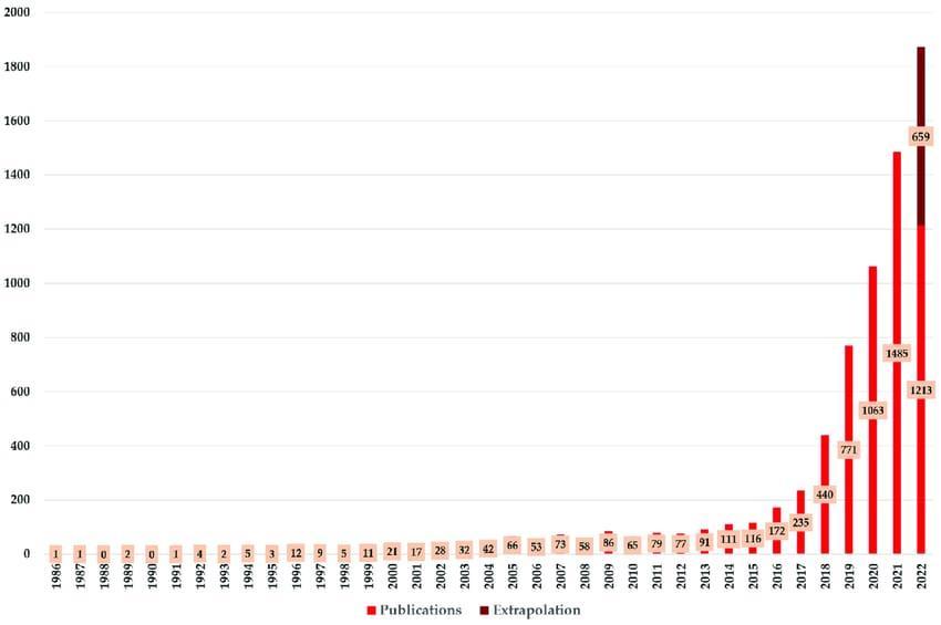 Fig-1showstheannual production of research dealingwithAIforcancer detection.The 1980ssawthe publication ofthe firststudyonthesubject.Theinitialarticlewaspublishedin1986.Anexpertsystemforcervicalcancerearlydetectionwas putforthinthisarticle[60].TheyearlyproductionofAIforcancerdiagnosisincreasedverylittleuntil1995.Therewereno publicationsonthissubjectin1988or1990.Thenumberofpublicationsonlyincreasedmodestlyintheensuingyears.In 2014,theannualproductionsreachedthe100-markforthefirsttimewith111publications.AIhasbecomemorerelevantin the realm of cancer diagnosis as its significance and possibilities have grown overall. Consequently, the majority of publicationshavebeenreleasedinthelastfewyears(2019–2021).PriortothedatacollectionforourstudyonSeptember 23,2022,1213publicationshadalreadybeenpublished.Weanticipatethatthetrendofrisingpublicationswillcontinuein 2022sinceitseemsstatisticallythatmorearticlesarereleasedinthefinalmonthsofayear[21].Anextrapolationleadsus tobelievethattherewillbe1872publicationsintotalin2022,withanestimated659piecesreleasedafterSeptember23.