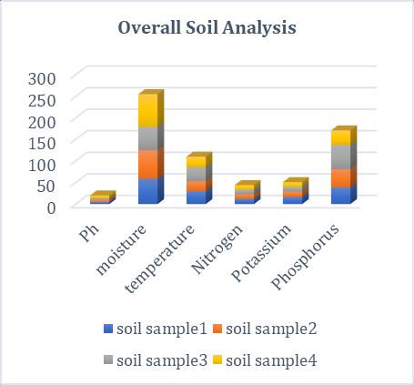 This is the overall analysis of all four soil samples, as it depicts all four parameters of each soil sample. And according to this prediction, crops is done via a mobile applicationusingBluetooth.Asperanalysisthepredictions for soil sample one and three are cotton, wheat, chickpea cultivation.Similarlyforsoilsampletwo,soybean,turmeric,