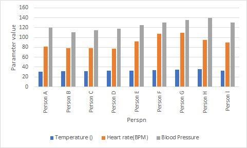 Stress detection among the individuals is determined by deviations in physiological parameters temperature, heart rate, blood pressure, and skin response from their normal ranges.Stressedindividuals(E,F,G,H)consistentlyexhibit elevated blood pressure (ranging from 125 mmHg to 140 mmHg,comparedtothenormal120/80mmHg)and,insome cases,elevatedheartrates(e.g.,107BPMforFand109BPM for G, above the normal range of 60–100 BPM). Despite