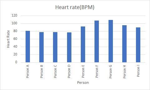 slightly lower-than-normal temperatures (33–36°C compared to 36.5–37.5°C), the heightened blood pressure and heart rate indicate stress. Conversely, non-stressed individuals (A, B, C, D, I) mostly have parameters within normal limits: heart rates between 77–90 BPM, blood pressureatornear120mmHg,andtemperaturesbelowthe normal range, but not indicative of stress. Although skin response values are uniformly high (around 1000 units) acrossallindividuals,stressdetectionappearstorelymore heavily on elevated blood pressure and heart rate. This suggests that these two parameters play a key role in identifyingstress,whereasskinresponsemayserveasaless variablebaselineinthisdataset.