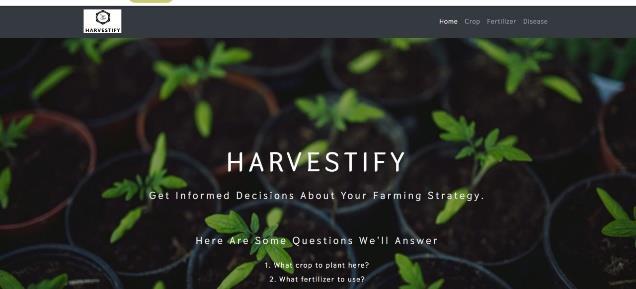 The home page of the ”Harvestify” system offers a visually appealing and functional interface designed to assist farmers with smart agricultural decisions. It dis plays a vibrant background of seedlings, reinforcing the theme of sustainable agriculture. The platform’s tagline, “Get Informed Decisions About Your Farming Strat egy,” highlights its purpose. Below, it introduces two key questionsithelpsanswer:“Whatcroptoplanthere?”and “What fertilizer to use?” The navigation bar at the top provides easy access to different sections: Crop, Fertilizer, and Disease. This design ensures simplicity andaccessibility, guidingusersthroughcrucial decisionmakingprocessesefficiently