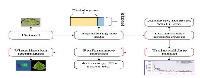 A Plant Disease Detection System flow diagram begins with users uploading plant images. The images undergo preprocessing (like resizing or noise removal) and are analyzed by a trained machine learning model, such as CNN.Themodelclassifiesthediseasebasedonpatterns, and the system outputs the disease name with possible solutionsortreatments.