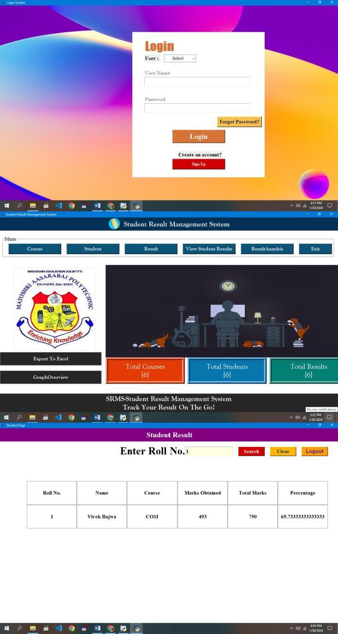 The user interface of the Student Result Management System(SRMS)iscraftedusingtheTkinterlibraryinPython, offering a comprehensive platform for the administration of courses, students, and their academic results. The primary