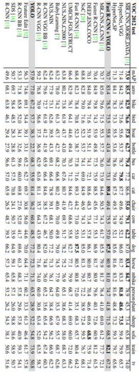 Table 3: 2012 PASCAL VOC status quo. The YOLO public leaderboardwascomparedtothefullcomp4(outsidedata allowed) as of November 6, 2015. For a number of