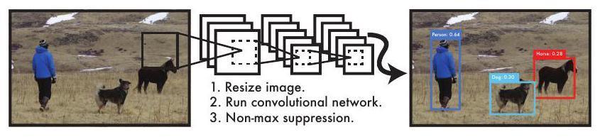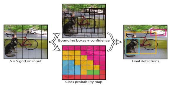 Thesystemconsistsofresizingtheinputimageto448x448, running a single convolutional network, and throttling detections based on model confidence techniques to construct picture bounding boxes and then classify them. The post-processing step, which follows classification, involves improving the bounding boxes, removing duplicates,andrescoringthemaccordingtotheitemsinthe scene [13]. Due to the need to teach each component separately,thesecomplexpipelinesareslowanddifficultto optimize.