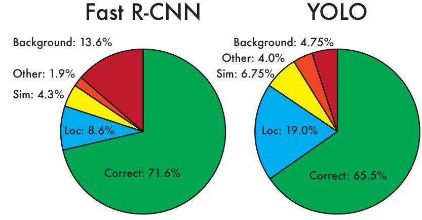 As a whole, all 20 classes contributed to the breakdown of mistake types, as shown in Figure 4.Things can be difficult for YOLO to pinpoint precisely. When it comes to YOLO, localization issues are far and away the most common cause of mistakes. While Fast R-CNN does increase its background mistake rate, it has drastically cut down on localization errors. Since 13.6% of its main detections are empty, they are not accurate.Fast R-CNN has a higher