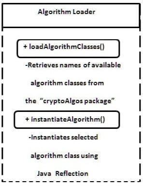 3) The AlgorithmLoader is a module designed to dynamically load and manage cryptographic algorithmsusedintheapplication.Itspurposeis to provide a flexible way to integrate different encryption and decryption algorithms without tightly coupling them to the main application logic.