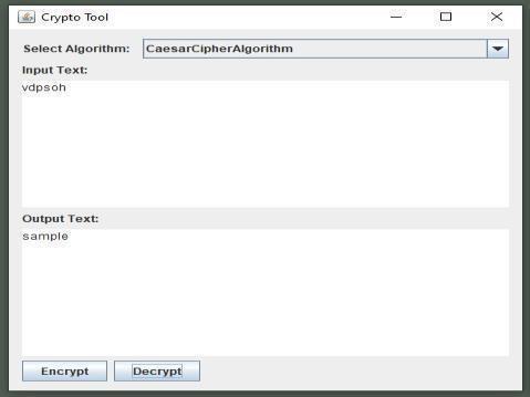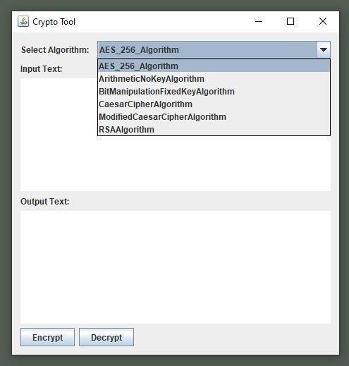 6) Scanning for Algorithm Classes: It scans the specified package (in our implementation "cryptoAlgos") for classes that implement the CryptoAlgorithm interface. Loading Algorithm Classes:Itloadsthealgorithmclassesdynamically using Java reflection. The classes are identified, andJavareflectionisusedtoloadthemintothe application dynamically. This is done using the Class.forName() method, which takes the fully qualified classnameasa stringandreturnsthe Classobjectforthatclass.
