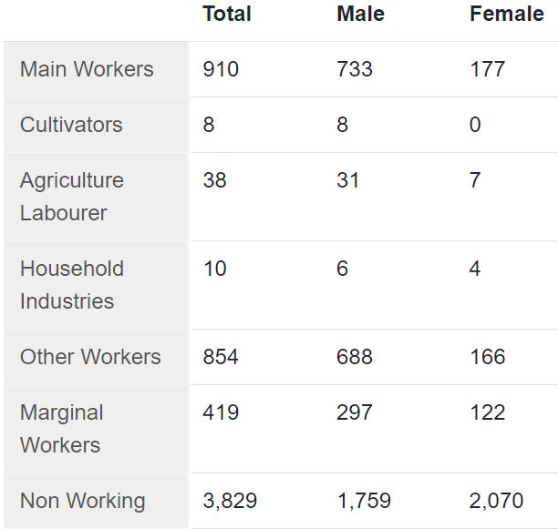 Of the 1,329 workers involved in Main Work, 8 are cultivators(ownersorco-owners),and38areAgricultural laborers,underscoringtheagriculturalsignificancewithin thecommunity'seconomiclandscape.[3]