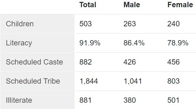 Among the populace, 10% are children aged 0-6 years, totaling503,with263maleand240femalechildren,leading toaChildSexRatioof913,surpassingtheAverageSexRatio.