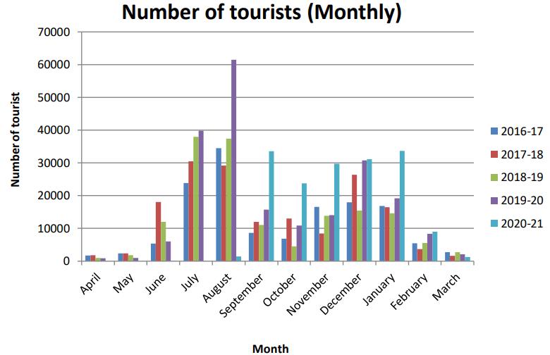 Chikhaldara is the only and a popular hill station in Vidarbha,itattractsnumberoftouriststhroughouttheyear. Thetouristinflowdataforpastfiveyearswascollectedfrom the tourist tax record of Chikhaldara Municipal Council (Annexure2).Touristinflowpermonthinyear2016-17to 2020-21isshownbelow: