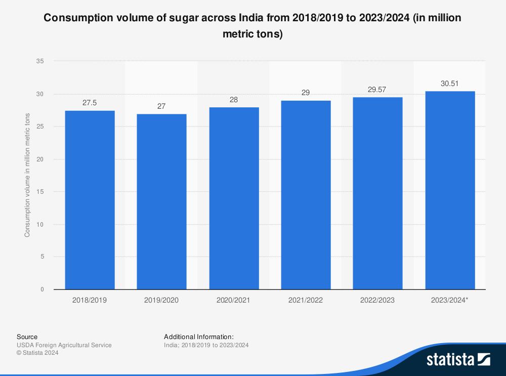 Anevenmorealarmingstatisticisthatofsugar-sweetenedbeverages.InurbanIndia,everyweekadolescentsconsume1.8 cansofcolaperweek,andthismightresultinaweightgainof1.3kgperchildperyear.Indiansconsumeroughly25.17kg ofsugarperpersonperyear,whichexceedstheworldwideconsumptionof23.7kg/year.AchangeintheIndianlifestyleis leadingtoanevengreaterincreaseinsugarconsumptionevery year.During2018-2019,thesugarconsumptionwas27.5 millionmetrictons,whichshotupto30.51millionmetrictonsduring2023-2024