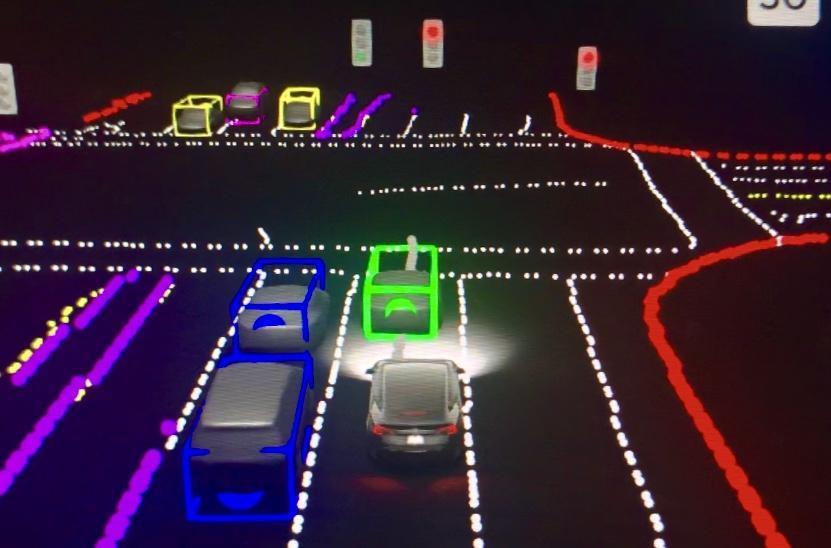 Fig -3: Visualization of a Tesla's AI perception system in self-driving mode, showing how the AI identifies and categorizesvehiclesandroadelements.