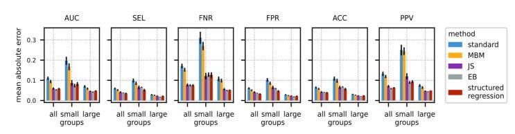 Chart -1: In this chart, the mean absolute error (MAE) estimates for six metrics using five different methods on diabetes data.Theevaluationis basedon20 draws ofthe dataset, considering three distinct groups: all patients, small groups (size at most 25), and large groups (size above 25). These results shed light on potential biases in healthcare AI models, emphasizing the importance of addressingdisparitiesacrosspatientsubgroups.