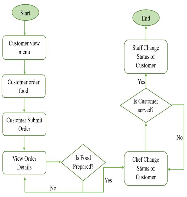 Figure 1-1 shows the Restaurant Ordering System Flow Chart.Whenclientsentertherestaurant,thestaffwillassist theminfindingaseat.Customerswillthenutilizethegadget givenbytherestauranttoseethemealmenu.Customerscan then place their orders. The chef and crew will get the clients'orderinformationwhentheyfillinthequantityof food and the table name and submit the order. When the dishisready,thechefwillmodifythestatusoftheclients' orders.Whenthedishisready,thestaffwillserveittothe clients. The order's status will be changed after all of the foodhasbeenserved.