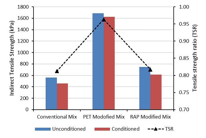 Tensile strength ratio (TSR) for the conventional, PET modified and RAP modified mixes were observed as 0.81, 0.96and0.82.ForHMA,theTSRshouldbegreaterthanequal to0.80.Thus,withintheacceptablelimits.