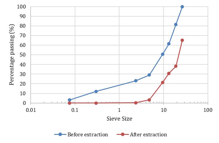 Furthermore,Chart2illustratestheparticlesizedistribution (PSD)curveobtainedforthegradationbeforeandafterthe extractionofbitumen
