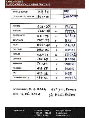 Keywords; AyurvedaBloodchemicalchemistrytest,chemicalbloodtestinAyurveda,Ayurvedalaboratorytest.Wholeblood estimationinAyurveda,bloodtestinAyurveda,Ayurvedabloodtest