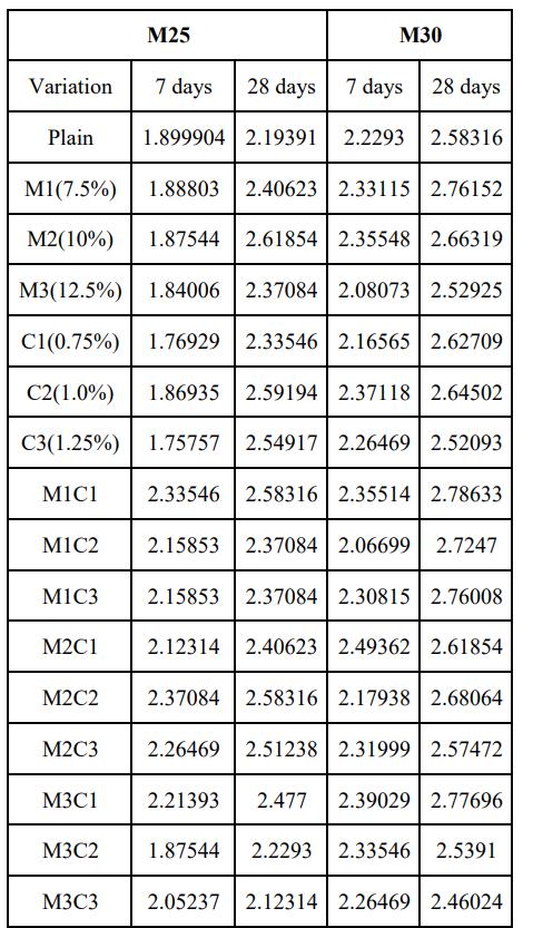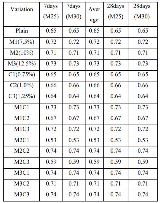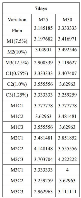 Thecompressivestrengthofconcretewasevaluatedatthe ageof7days,28daysand56days.Toknowwhatstrengthis gainedbyconcreteofgradeM25andM30ascomparedwith itsown56dayscrushingstrength,thenormalizedcrushing strengthvalueswereconsidered.Thesewereobtainedasthe ratioofthecrushingstrengthatrequiredagetothatat56 days.Theresultsobtainedaretabulatedbelow.