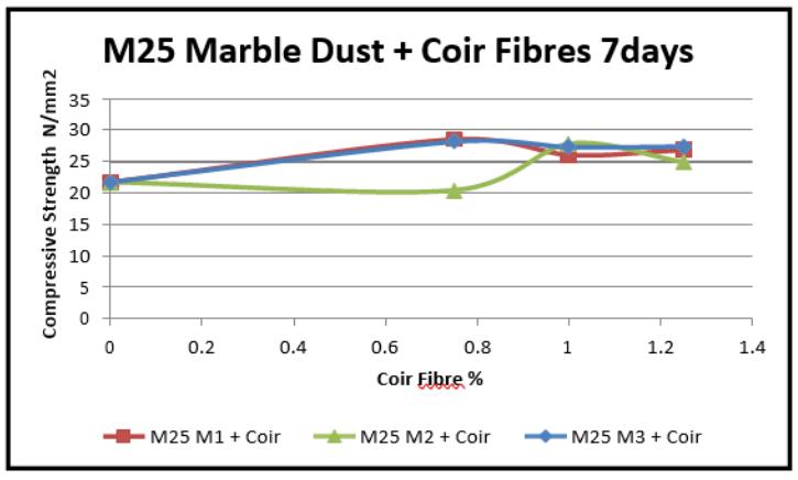 Graph-6.7 VariationinCompressivestrength(7days)for MarbleDust+CoirFibres(M25)